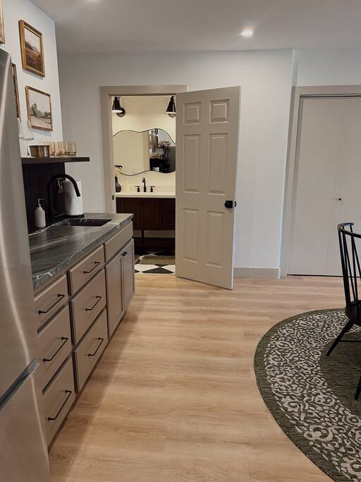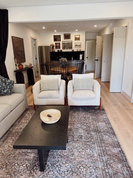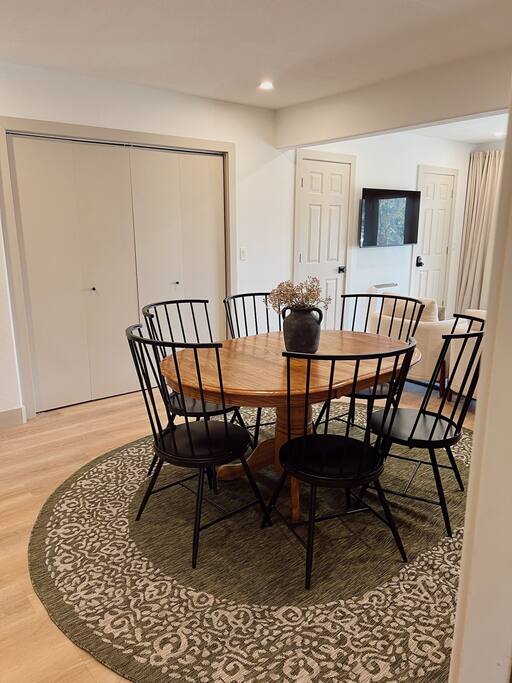 There is a kitchenette with a fridge, small sink, microwave and Keurig and a dining table that seats 6. In the lower level living room the sofa pulls out to make a comfy queen size bed. Linen for the pull out bed can be found in the closet closest to the couch. There is a TV in the lower living room as well as two additional accent chairs for seating.