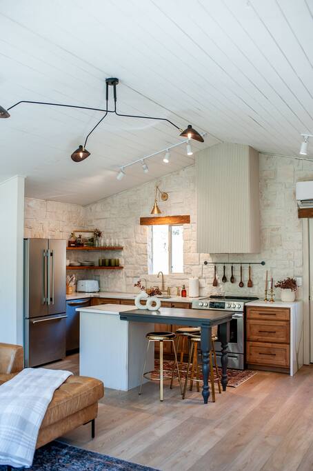 The Lightner Creek Cabin is 1800 Square feet with an open and airy floor plan! Our full size kitchen has a fridge and freezer, pots & pans, electric stove, microwave (in the pantry), toaster, Keurig and pods, and other cooking essentials (olive oil, salt, pepper, spoons, cups, silverware, etc.). The island has space to seat 3 guests (there is a dining table outside and on the lower level). The living area has a TV, leather sectional and two accent chairs and is large enough to fit all 8 guests.